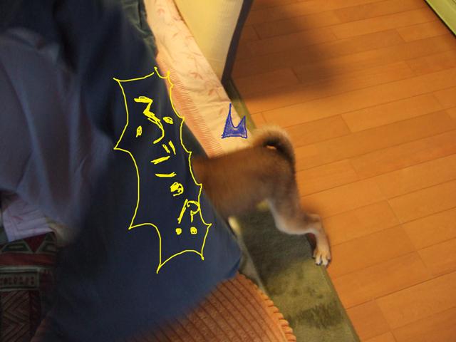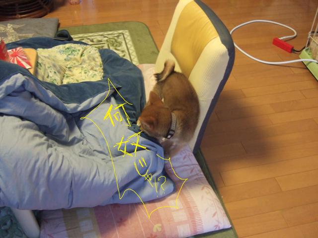 もみじはその布に向かって突進!一緒にまかれちゃうよ、もみじ。